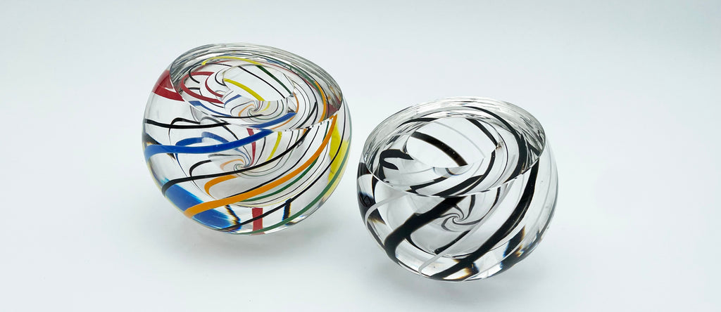 Part of the Collectors Items Range Twisted Cane Geodes were produced between 2014-2015. They were inspired by Venetian cane work vases which I came across on a visit to Murano. My aim was to create a crisp Scandinavian effect, emphasising the clarity of the glass and so drawing the eye into the Optical Magic without any of the extravagant detail which is often seen in Venetian glass.